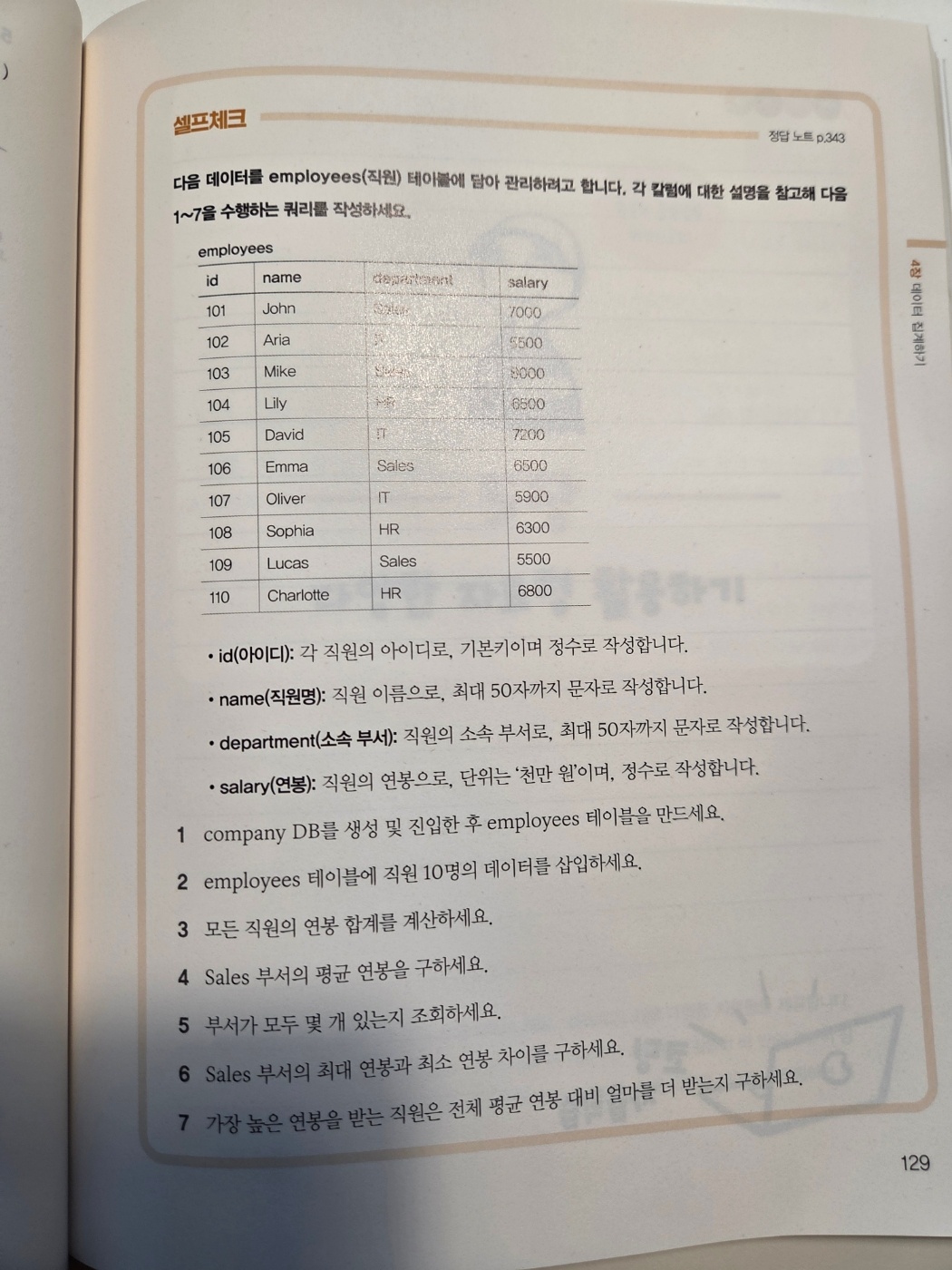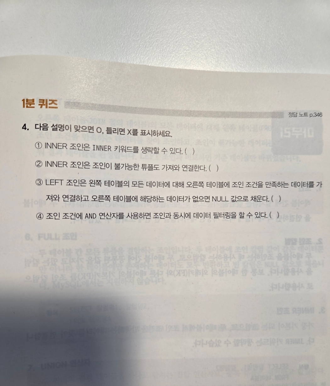저는 조인 부분이 약해서 이 부분을 열심히 보고있는데 여기서 1분 퀴즈로 이렇게 개념도 확인할 수 있어서 너무 좋았습니다. 다른 책보다는 이 책으로 개념서랑 문제풀이까지 할 수 있을 거 같고 혹시나 부족할 일은 없겠지만 부족하면 노랭이 문제만 풀면 큰 도움이 될 것 같습니다~!