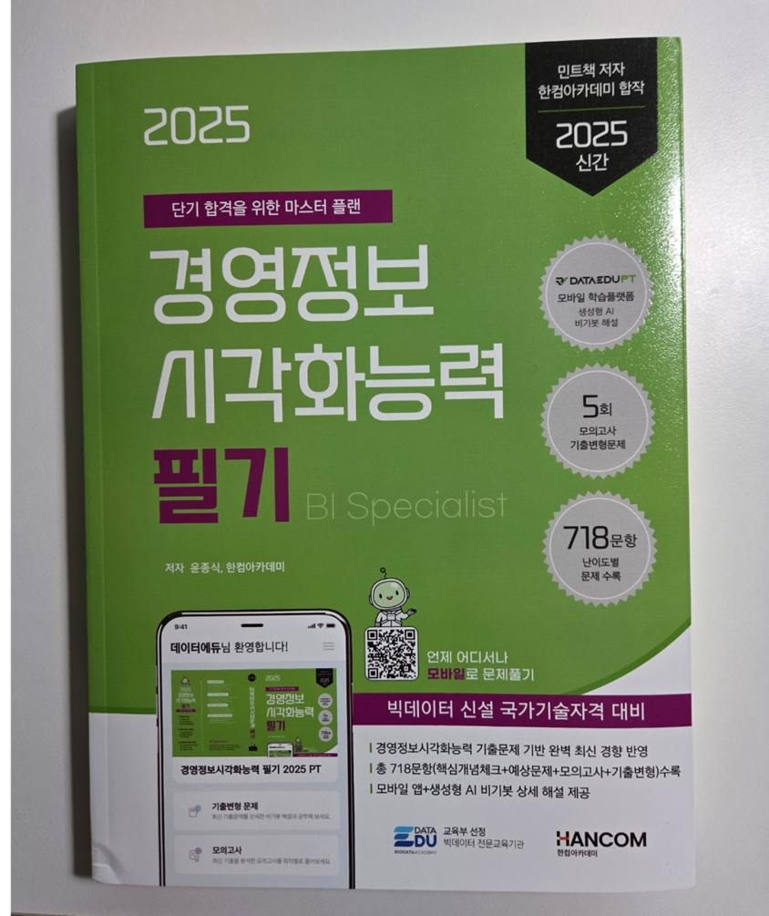 데이터 에듀에서 나온 경영정보시각화 필기 서적인데, 직접 보고나서 상당히 해설도 잘 되어있고 내용도 충분해서 정보가 많이 없는 시험에서는 큰 도움이 될 것 같다고 느꼈습니다.